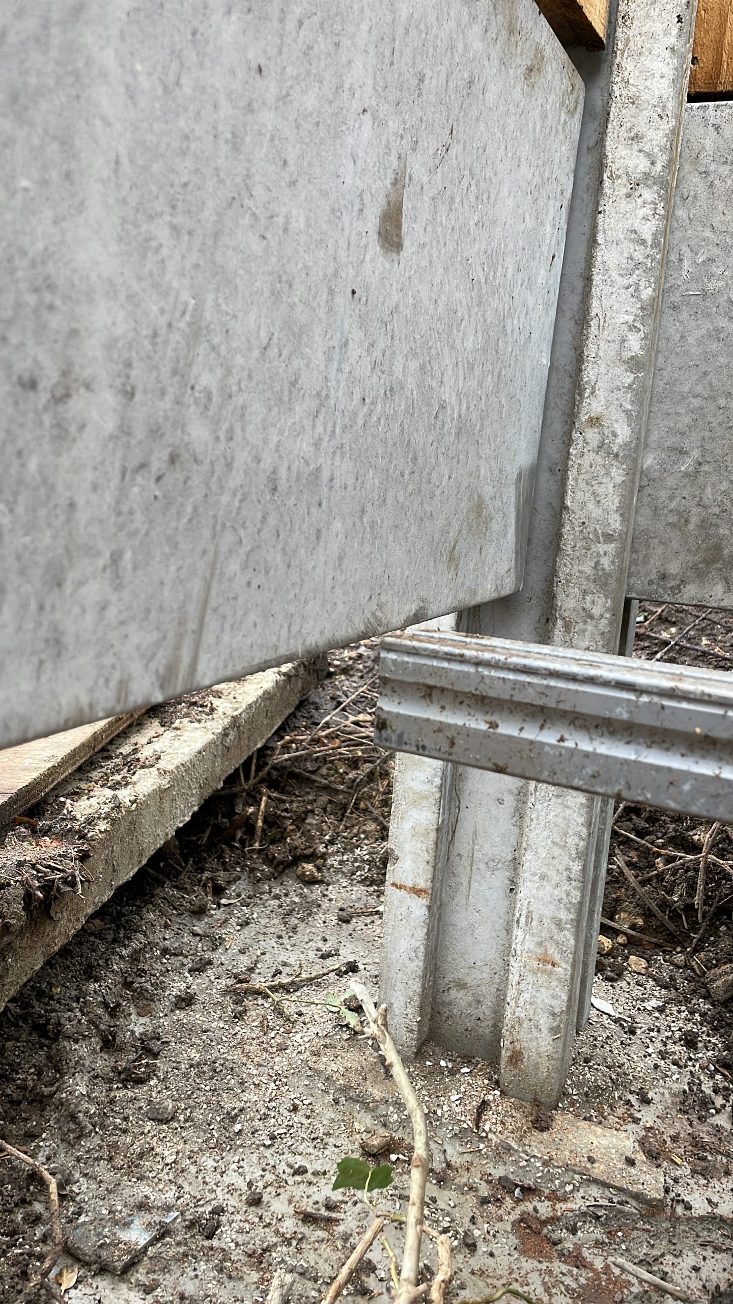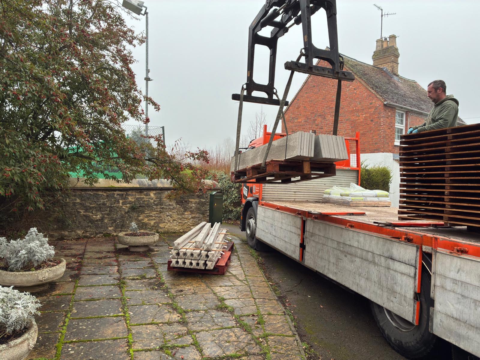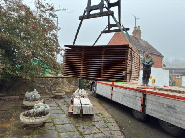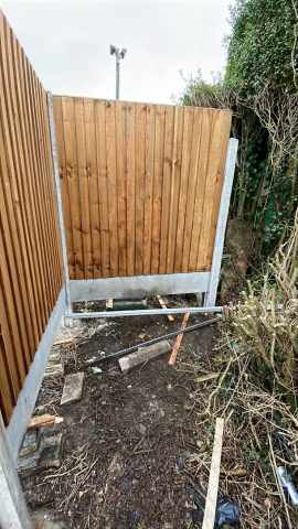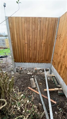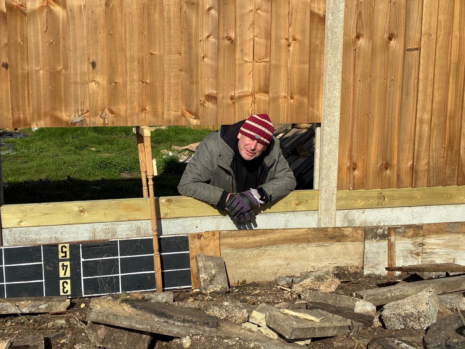 The remaining hedge was removed by early March and erection of the new fence was completed shortly afterwards. Work then commenced on building the pergola framework, fitting the drains and laying the new concrete base.
