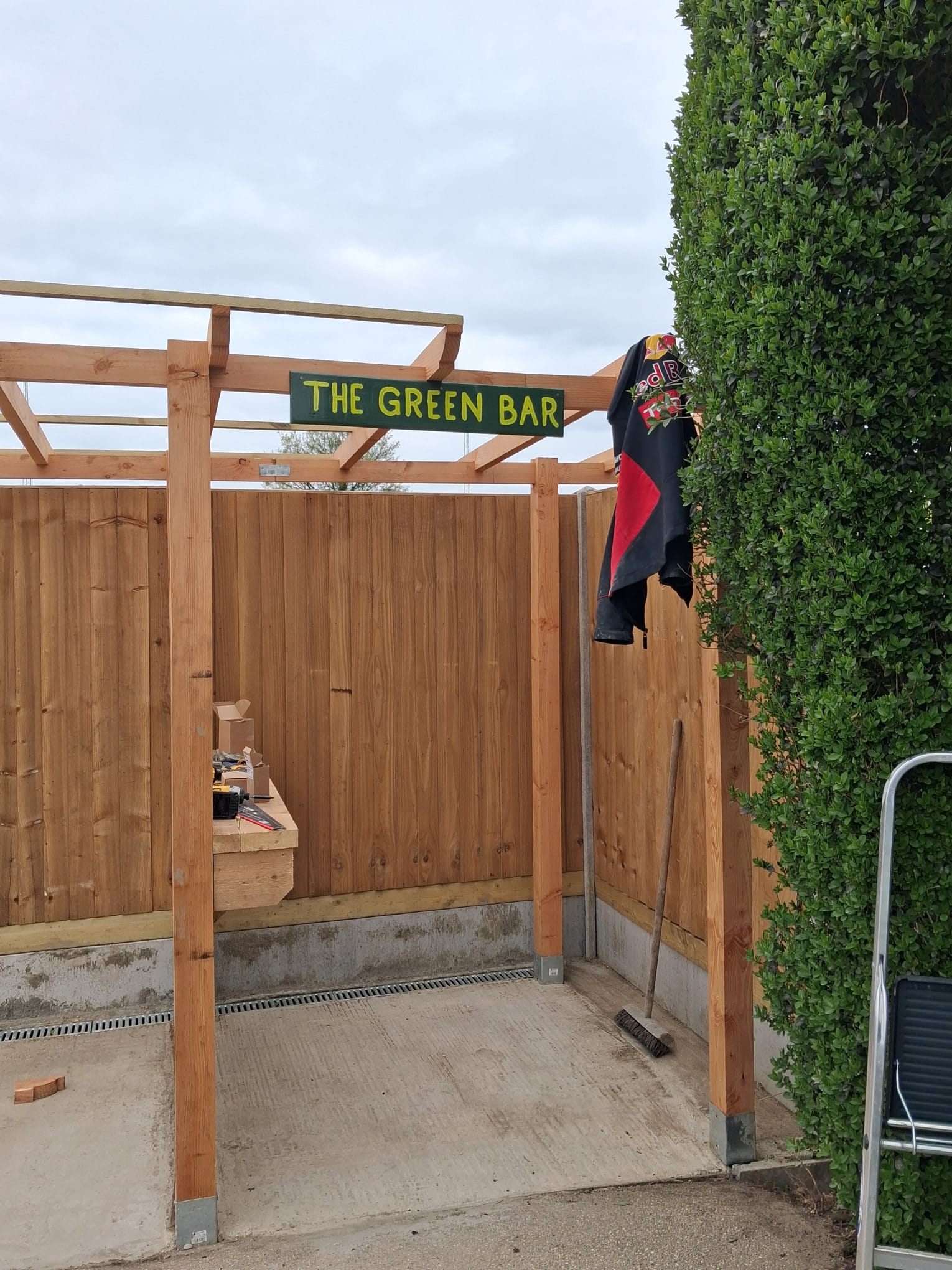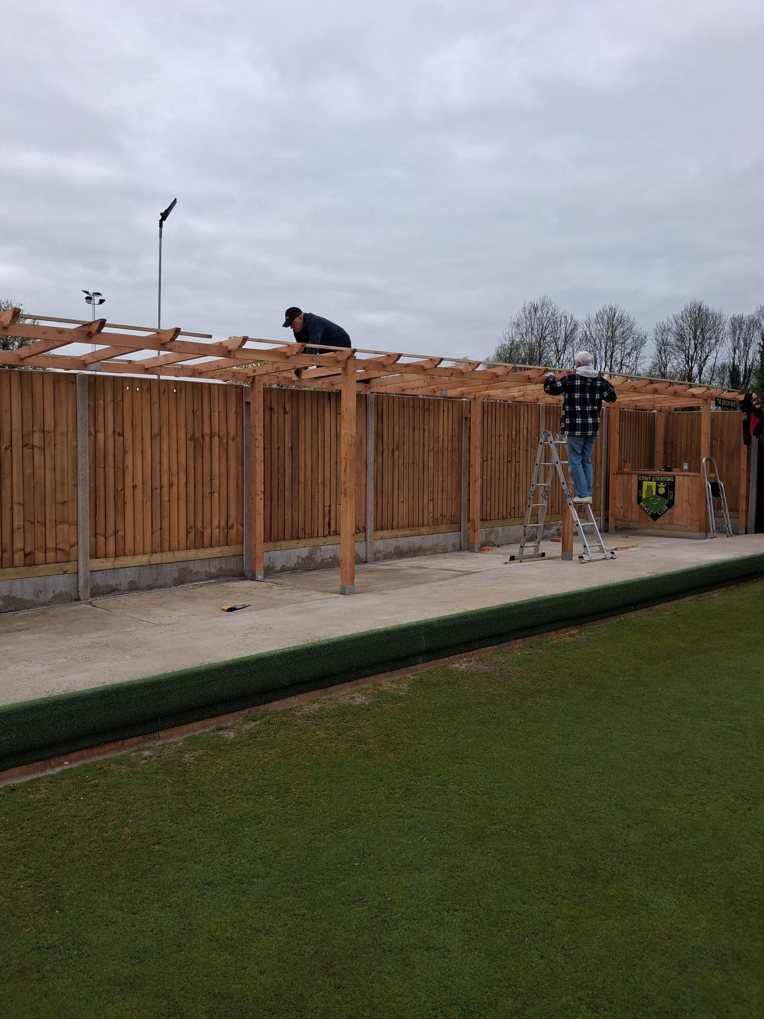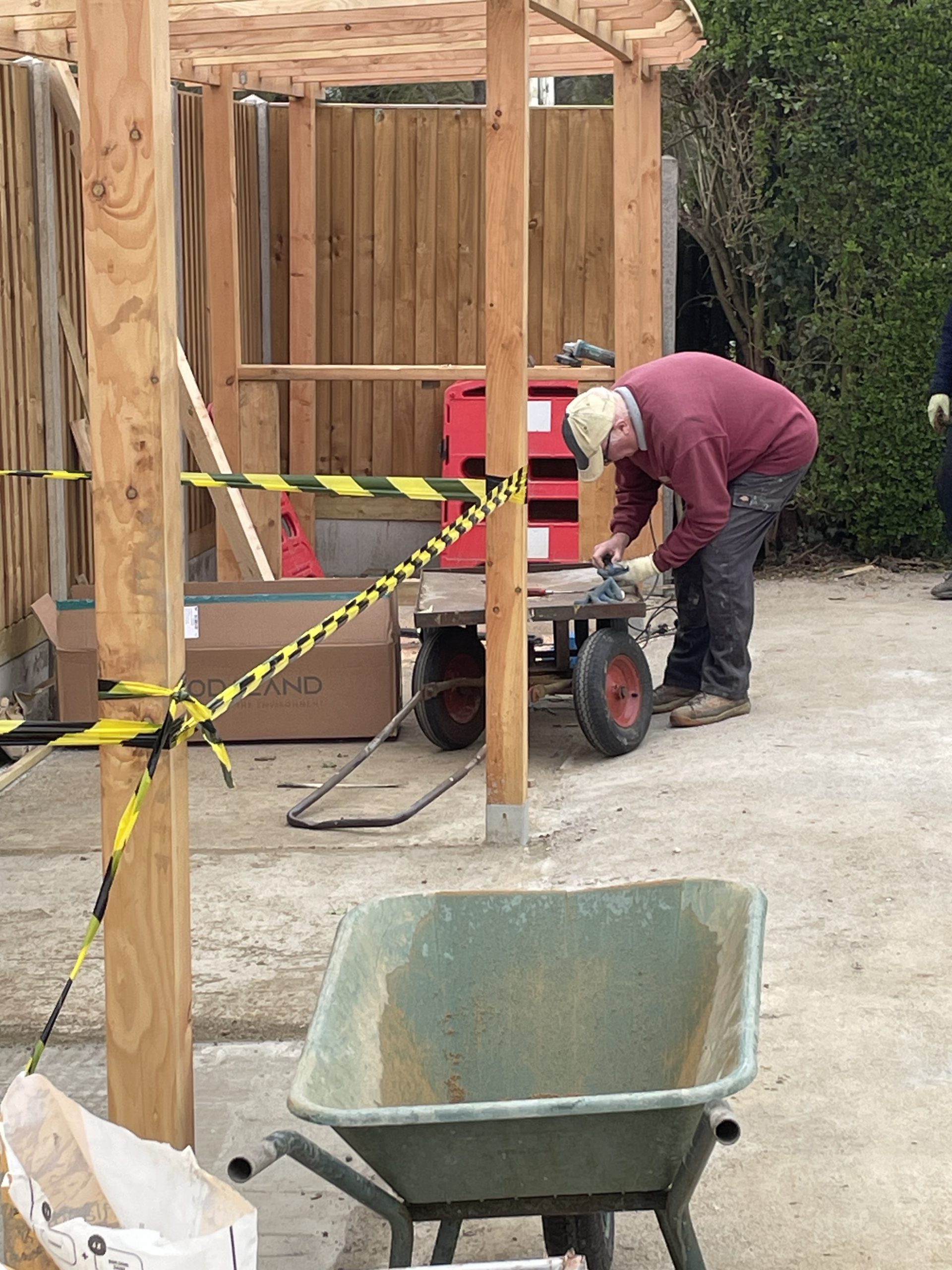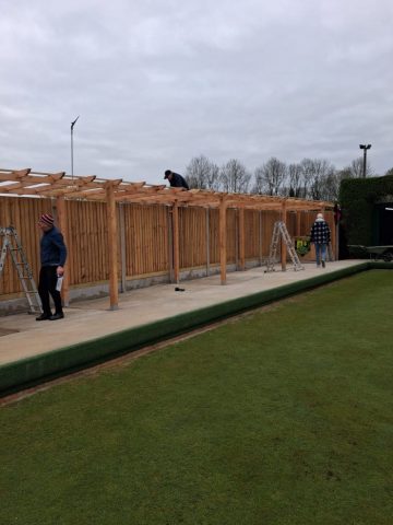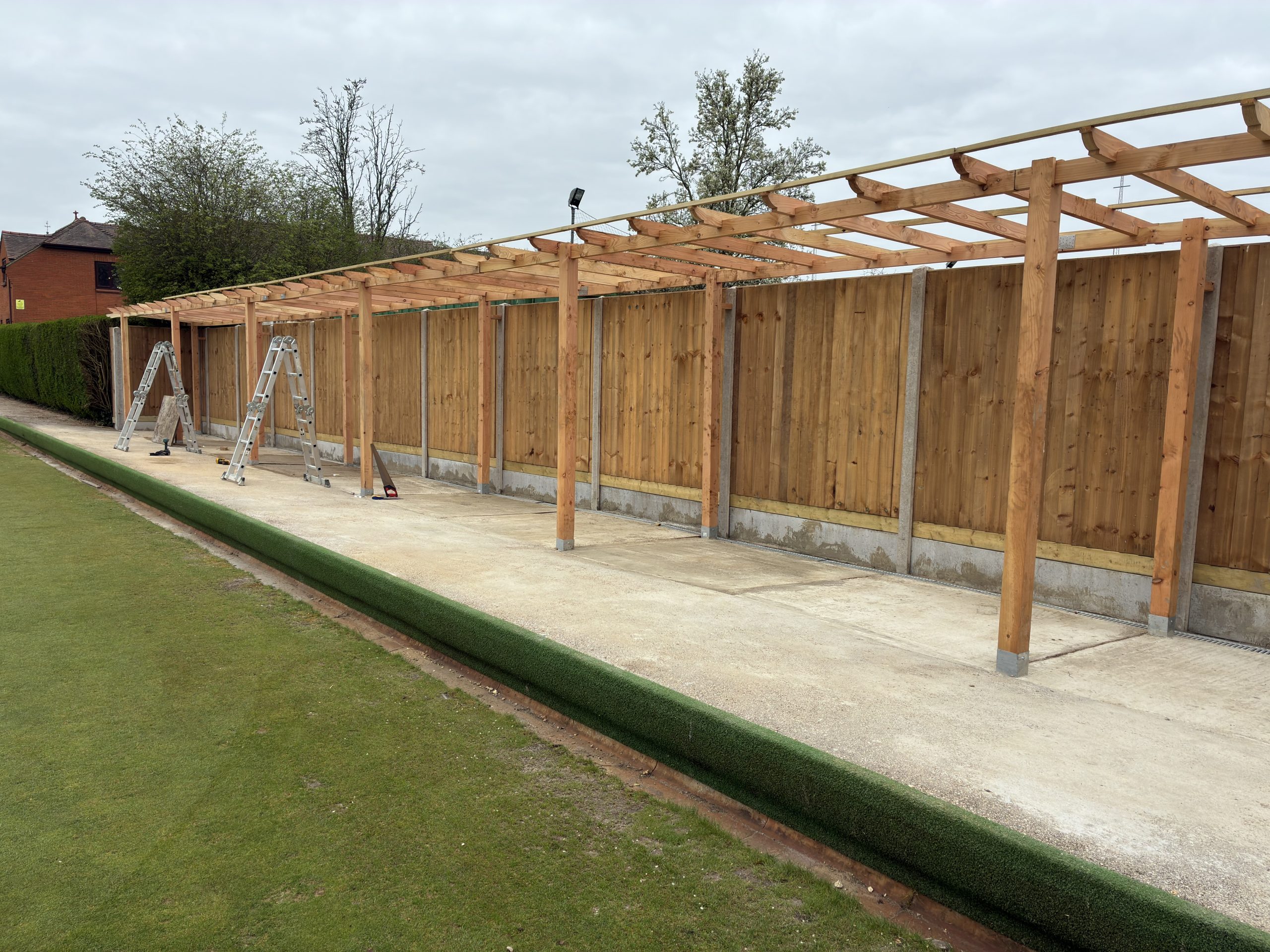 At this point (4th of April) works that remain to be done are 7 sections of pergola roof sheeting to be installed. Dave Wallace will then route an electrical supply round to the area in order for us to install some lighting.