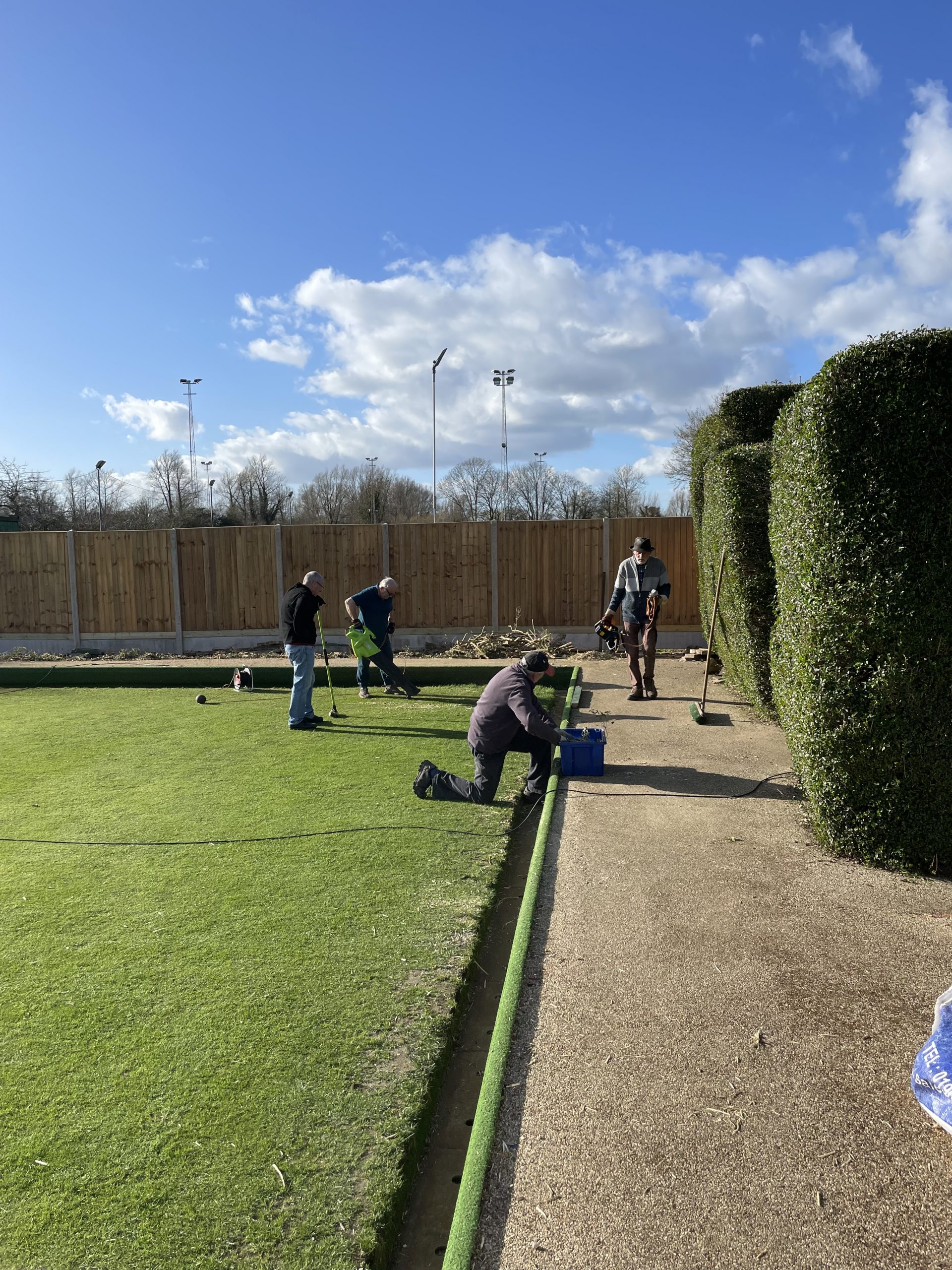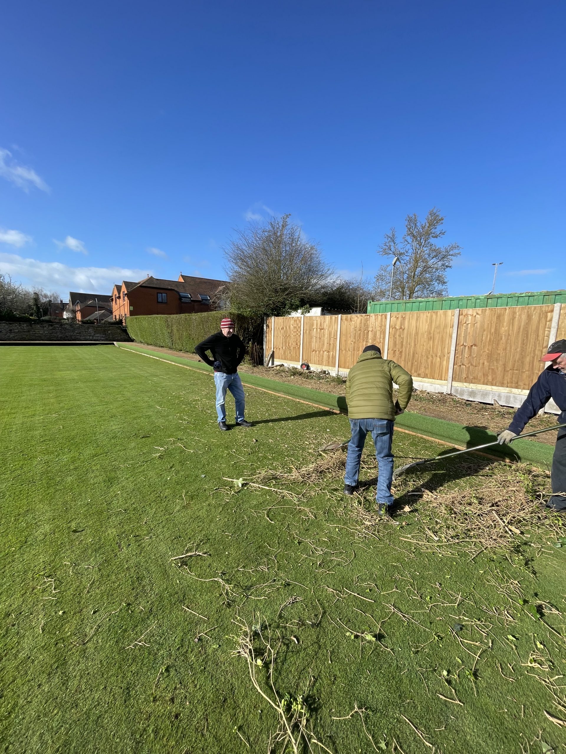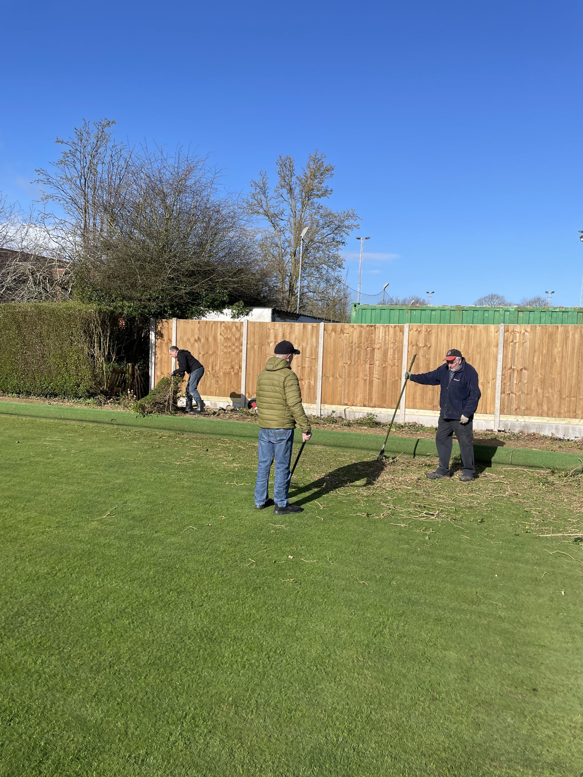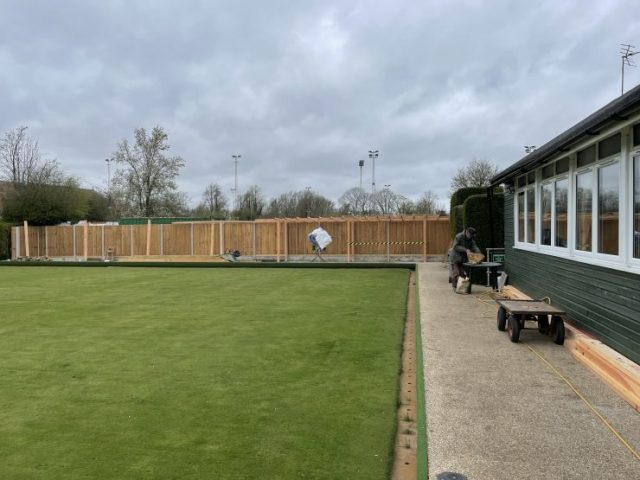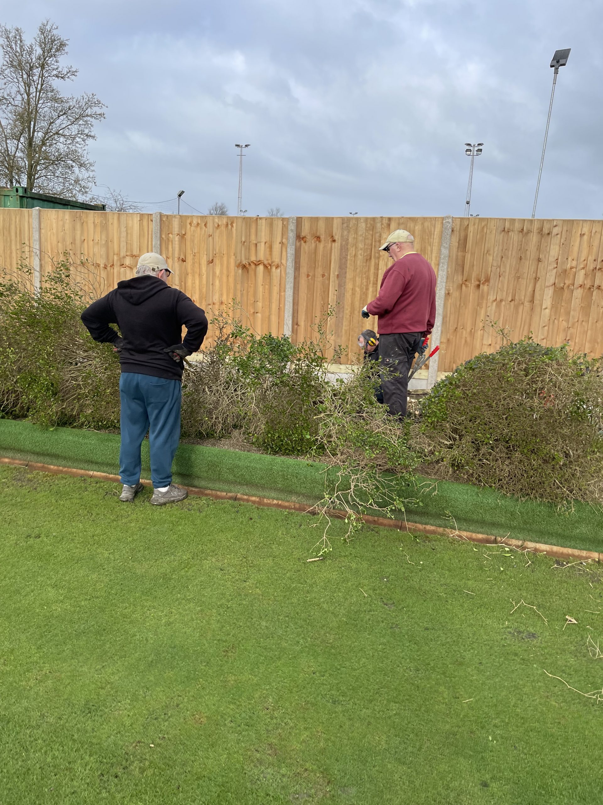 Pete Almond & John Lonergan had discussions early on with the football club over the boundary location, with a favourable outcome for the Bowls club. The position of the new fence was agreed and work began in early January to stake out the boundary and to remove the back half of the hedge in order to accommodate the new fence position.